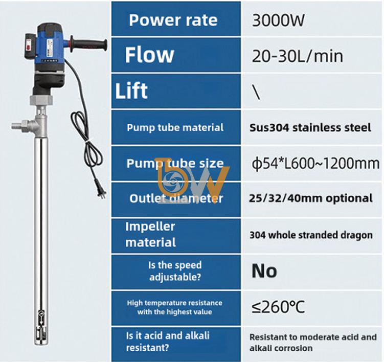 Bơm điện chịu nhiệt cho thùng phuy JDT-3000W-JLG260 phù hợp cho các bồn chứa IBC 1 tấn nhờ thiết kế ống dài linh hoạt, cấu tạo inox chịu nhiệt và khả năng hút – đẩy ổn định. Với khả năng làm việc hiệu quả trong bồn chứa lớn, sâu và môi trường nhiệt độ cao, JDT-3000W-JLG260 là giải pháp lý tưởng cho các doanh nghiệp cần bơm chiết chất lỏng từ bồn IBC một cách an toàn, bền bỉ và hiệu quả.