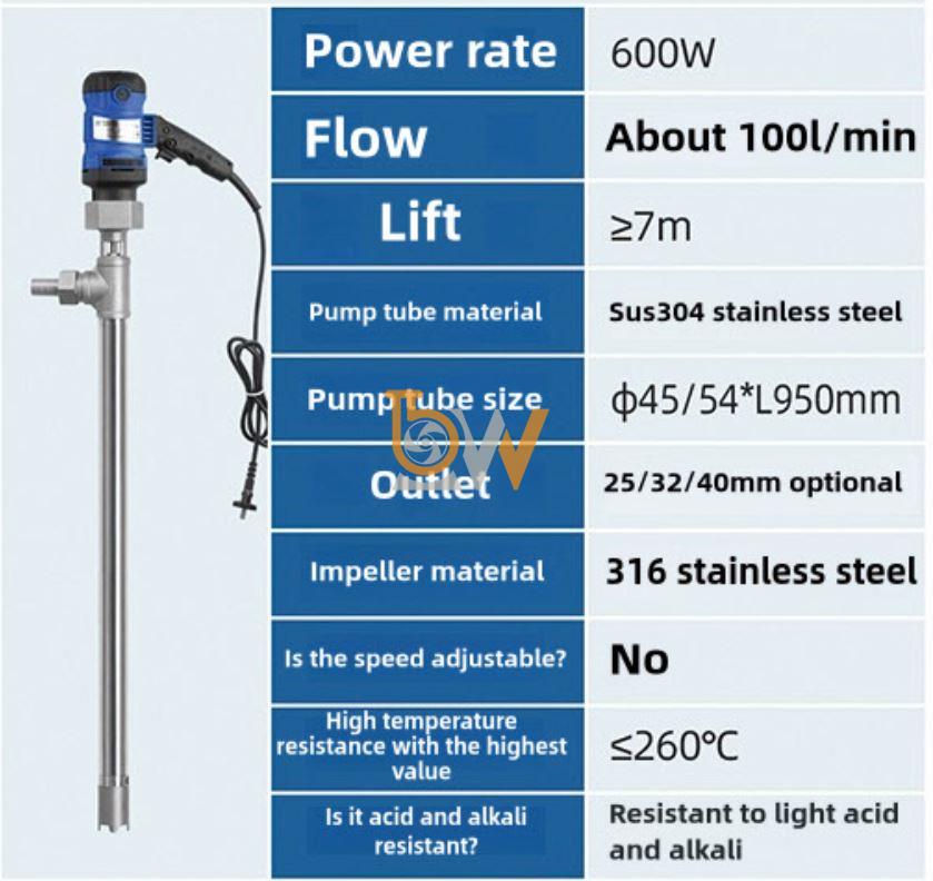 Bơm chìm hút thùng phuy nhiệt độ cao JDT-600W-G260 xử lý chất lỏng nhiệt độ cao nhờ vật liệu chịu nhiệt, seal làm kín chuyên dụng, mô-tơ cách nhiệt tốt và cơ chế tự làm mát khi đặt chìm. Với thiết kế tối ưu, thiết bị vận hành ổn định, an toàn và bền bỉ trong môi trường công nghiệp xử lý dầu nóng, dung môi hoặc hóa chất.