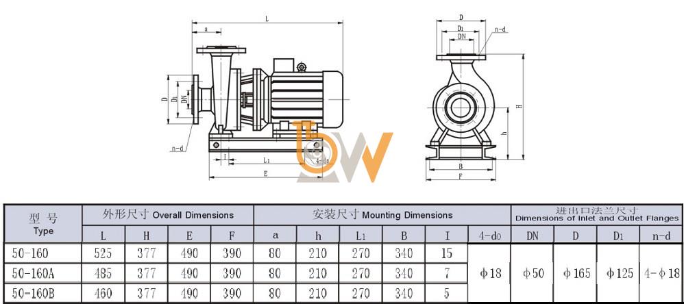 Bản vẽ cấu tạo và kích thước bơm nước trục ngang mã SLW-ISW50-160 động cơ 3 kw