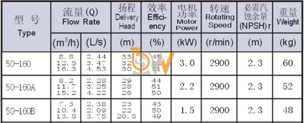 Bảng thông số kỹ thuật bơm nước trục ngang mã SLW-ISW50-160 động cơ 3 kw