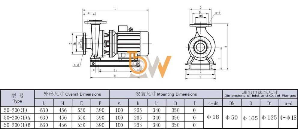 Bản vẽ cấu tạo và kích thước bơm nước trục ngang mã SLW-ISW50-200-I động cơ 7.5 kw