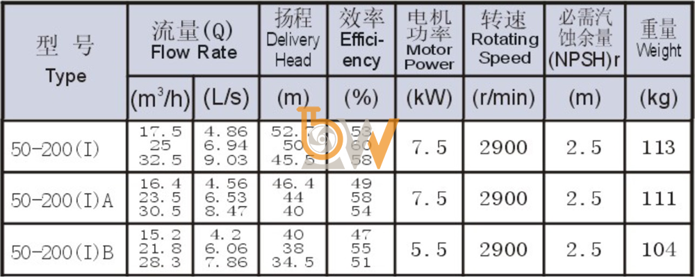 Bảng thông số kỹ thuật bơm nước trục ngang mã SLW-ISW50-200-I động cơ 7.5 kw