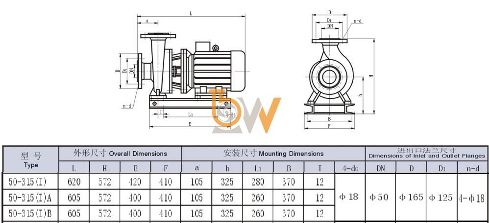 Bản vẽ cấu tạo và kích thước bơm nước trục ngang SLW-ISW50-315-I