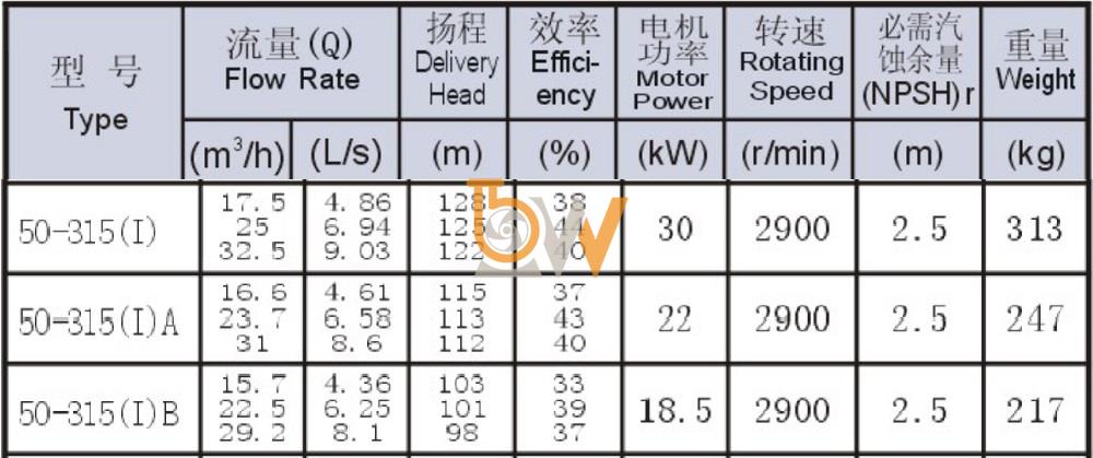 Bảng thông số kỹ thuật bơm nước trục ngang SLW-ISW50-315-I