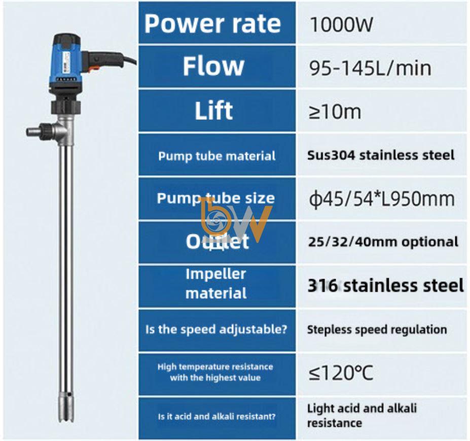 Bơm dầu phuy điện JDT-1000W-G120 được thiết kế phù hợp với thùng phuy tiêu chuẩn, đặc biệt là phuy 200 lít. Chiều dài ống hút, trục đứng và vị trí lắp được tính toán để bơm làm việc hiệu quả mà không cần điều chỉnh.
