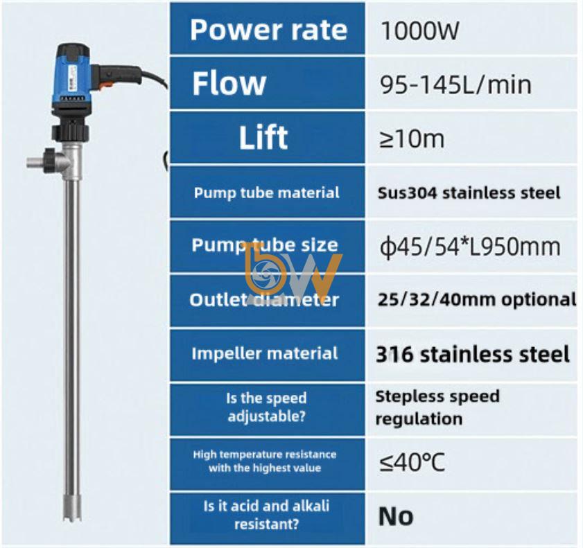 Bơm cắm điện thùng phuy JDT-1000W-304SUS phù hợp để bơm các loại hóa chất tẩy rửa công nghiệp thông dụng, dung dịch vệ sinh thiết bị, dung dịch làm sạch bề mặt kim loại và nhựa có mức ăn mòn không quá cao.