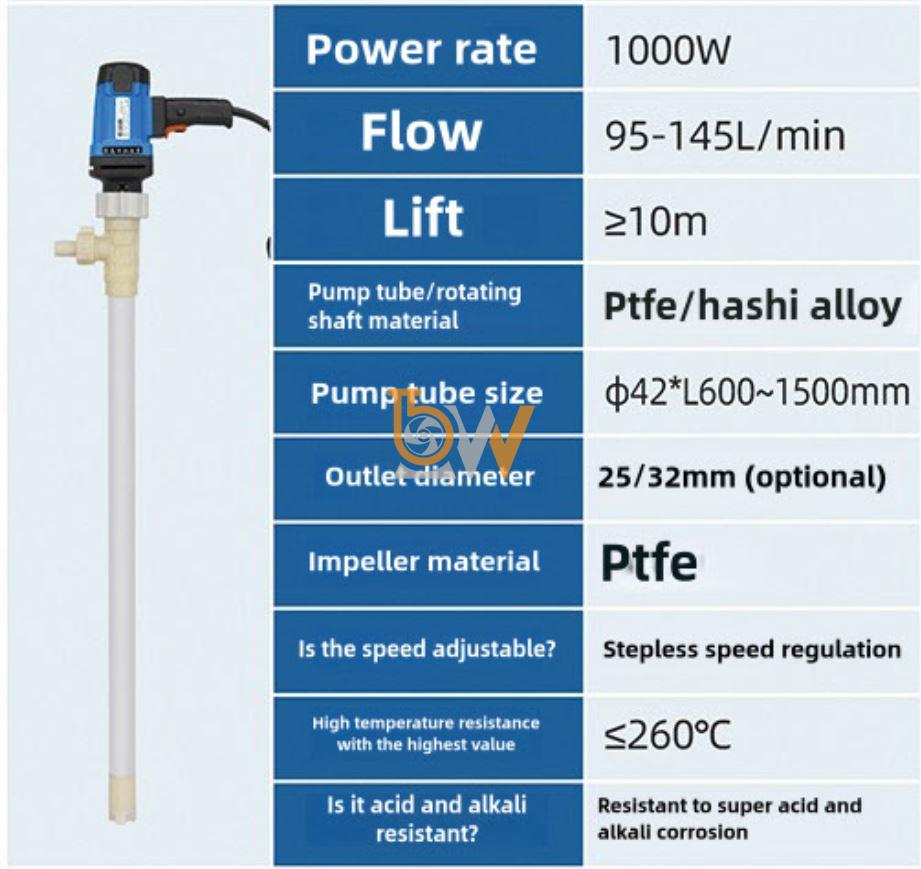 PTFE là vật liệu có tính trơ hóa học cao, nghĩa là không phản ứng với hầu hết các axit, bazơ và dung môi độc hại. Nguyên lý này giúp bơm điện nhúng thùng phuy hóa chất chống ăn mòn model JDT-1000W-PTFE: