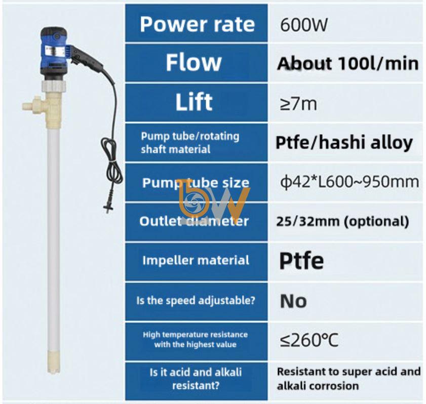 Với khả năng chịu nhiệt lên đến hơn 200°C, không biến dạng và không phản ứng hóa học, bơm thùng phuy hóa chất JDT-600W thân PTFE mang lại hiệu suất ổn định, độ bền vượt trội và an toàn tuyệt đối trong môi trường nhiệt độ cao. Đây là lựa chọn lý tưởng cho các quy trình công nghiệp đòi hỏi độ tin cậy và khả năng chịu nhiệt tối ưu.