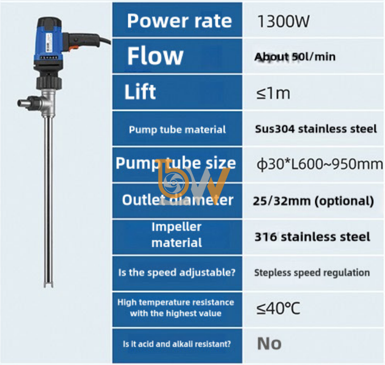 Cánh bơm và trục bơm được thiết kế cân bằng, giúp phân bố lực đều khi quay. Trong trường hợp chất lỏng có độ nhớt tăng cao hoặc xuất hiện cặn nhẹ, Bơm thùng phuy JDT-1300W-30 SUS304 sẽ làm việc trong trạng thái tải tăng dần, không tăng tải đột ngột.