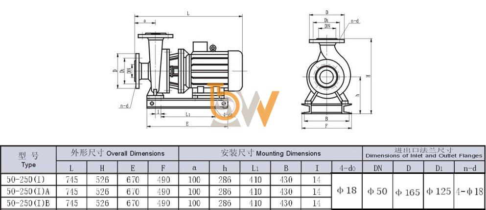 Bản vẽ cấu tạo và kích thước bơm nước li tâm trục ngang hút sâu 2.5m model SLW-ISW50-250-I