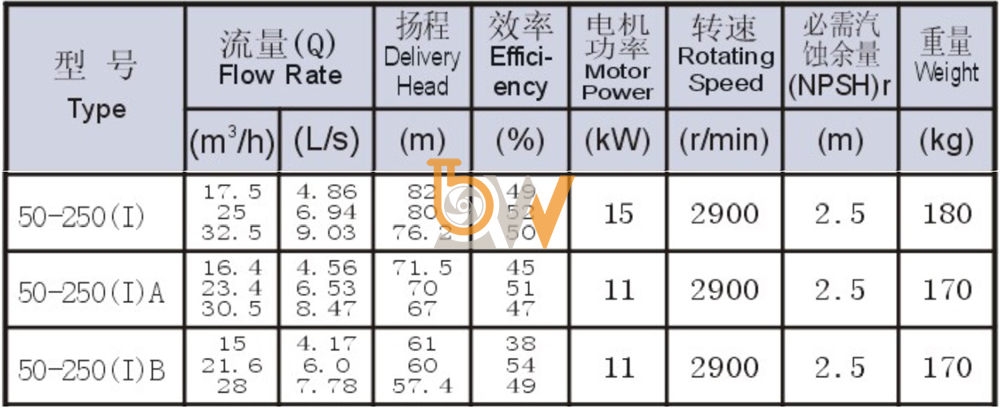 5. Tối đa. áp suất làm việc: 1.6MPa (DN200 trở xuống) và 1.0MPa (DN250 trở lên); tối đa. áp suất làm việc = áp suất đầu vào + áp suất đóng van (Q=0) và áp suất đầu vào 0,4MPa. Khi áp suất đầu vào cao hơn 0,4MPa hoặc mức tối đa của hệ thống. áp suất làm việc cao hơn 1,6MPa (DN200 trở xuống) hoặc 1,0MPa (DN250 trở lên) thì phải ghi chú riêng theo thứ tự để sử dụng gang than chì hình cầu hoặc thép đúc để chế tạo bộ phận chảy qua của máy bơm, và con dấu cơ khí phải được chọn theo cách khác.
