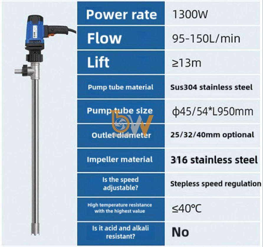 Trong nhiều ngành công nghiệp và phòng thí nghiệm, axit loãng được sử dụng thường xuyên cho các công đoạn xử lý, pha chế hoặc vệ sinh hệ thống. Việc bơm axit loãng đòi hỏi thiết bị có khả năng chống ăn mòn, vận hành ổn định và đảm bảo an toàn cho người lao động. Bơm điện thùng phuy JDT-1300W-304SUS là giải pháp phù hợp cho nhu cầu này nhờ thiết kế chuyên dụng và vật liệu đạt yêu cầu kỹ thuật.