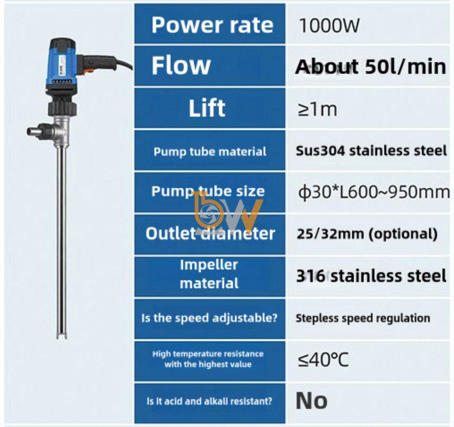 Bơm thùng phuy inox chịu nhiệt JDT-1300W-G260 hoạt động theo nguyên lý trục đứng, hút chất lỏng trực tiếp từ đáy thùng phuy. Cơ chế này đặc biệt hiệu quả với chất lỏng nhớt cao vì hạn chế hiện tượng hút khí hoặc ngắt dòng.