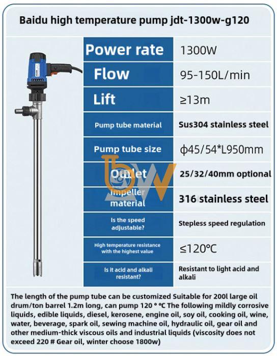 Bơm thùng phuy nhiệt độ cao JDT-1300W-G120 và cấu tạo ngăn rò rỉ điện