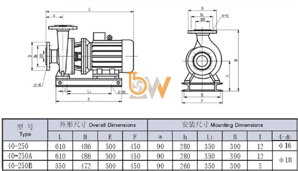 Bản vẽ cấu tạo và kích thước bơm nước trục ngang model SLW-ISW40-250 công suất 7.5 kw đẩy cao 82m