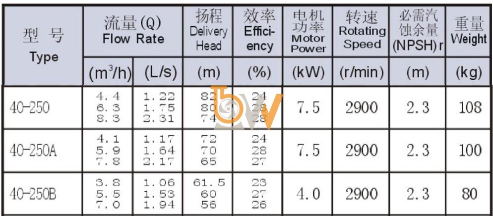 Bảng thông số kỹ thuật bơm nước trục ngang model SLW-ISW40-250 công suất 7.5 kw đẩy cao 82m