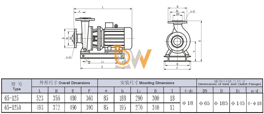Bản vẽ cấu tạo và kích thước bơm nước trục ngang model SLW-ISW65-125 công suất 3 kw đẩy cao 21.5m