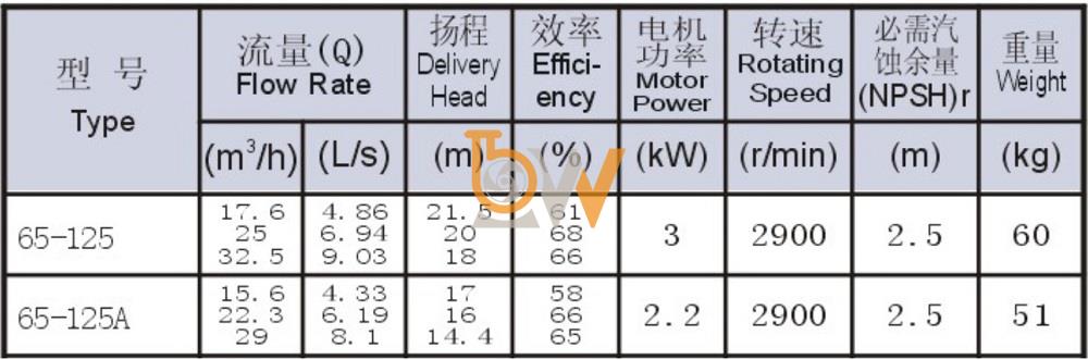 Bảng thông số kỹ thuật bơm nước trục ngang model SLW-ISW65-125 công suất 3 kw đẩy cao 21.5m