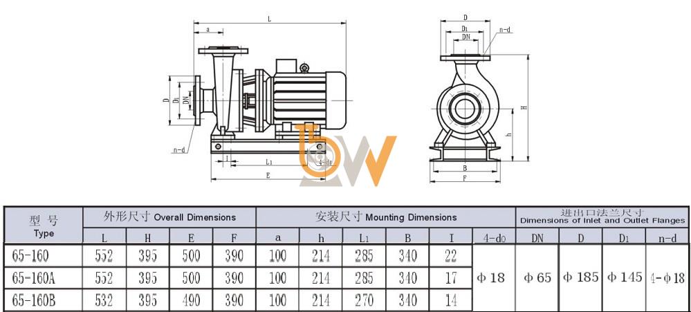 Bản vẽ cấu tạo và kích thước bơm nước trục ngang model SLW-ISW65-160 công suất 4 kw đẩy cao 34.4m