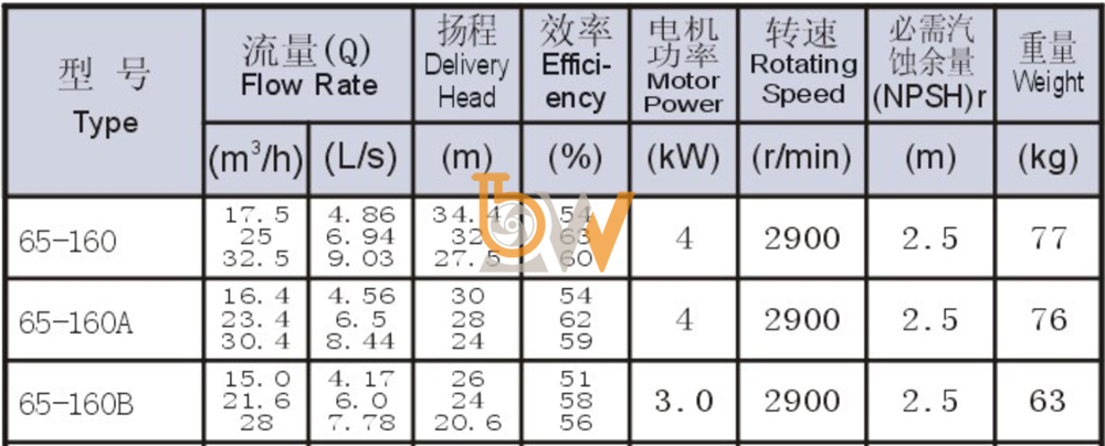 Bảng thông số kỹ thuật bơm nước trục ngang model SLW-ISW65-160 công suất 4 kw đẩy cao 34.4m