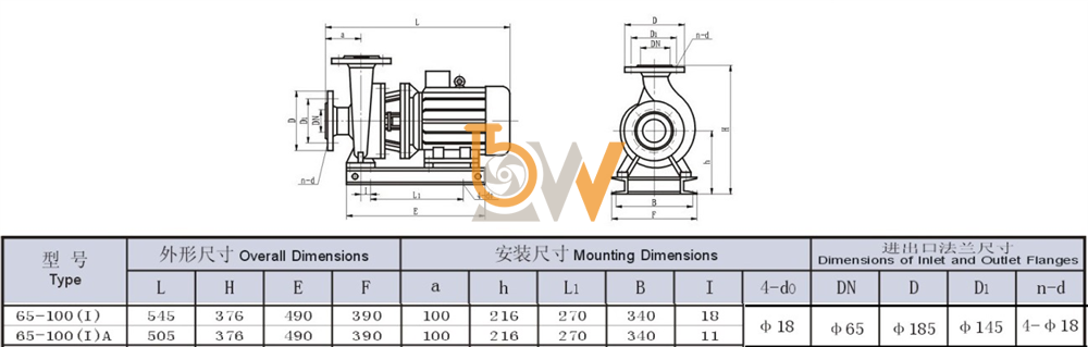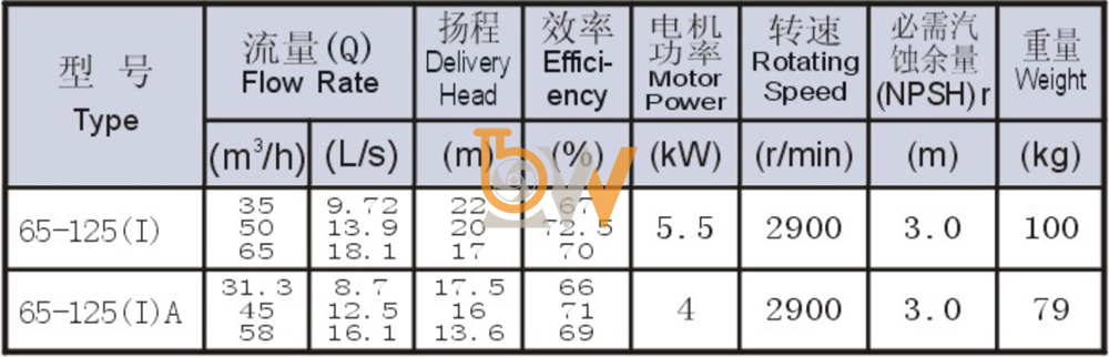 Bảng thông số kỹ thuật bơm nước trục ngang model SLW65-ISW65-125-I công suất 5.5 kw đẩy cao 22m