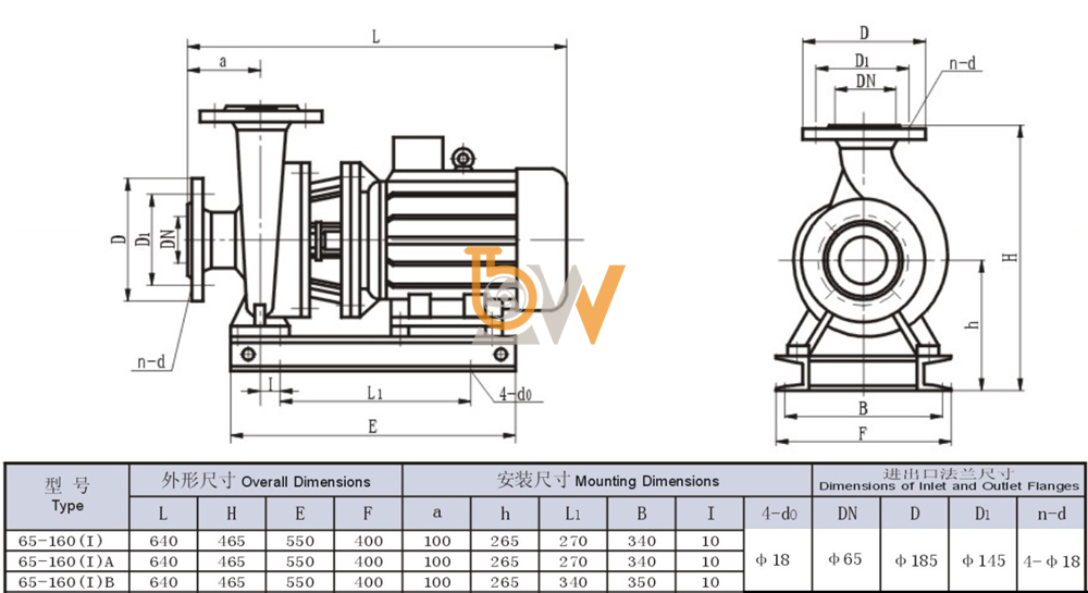 Bản vẽ cấu tạo và kích thước bơm nước trục ngang model SLW65-ISW65-160-I hiệu suất max 65 m3/h