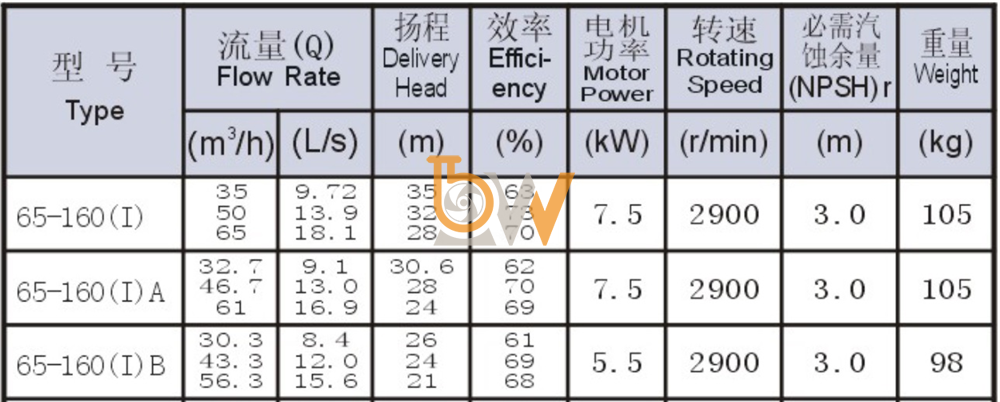Bảng thông số kỹ thuật bơm nước trục ngang model SLW65-ISW65-160-I hiệu suất max 65 m3/h