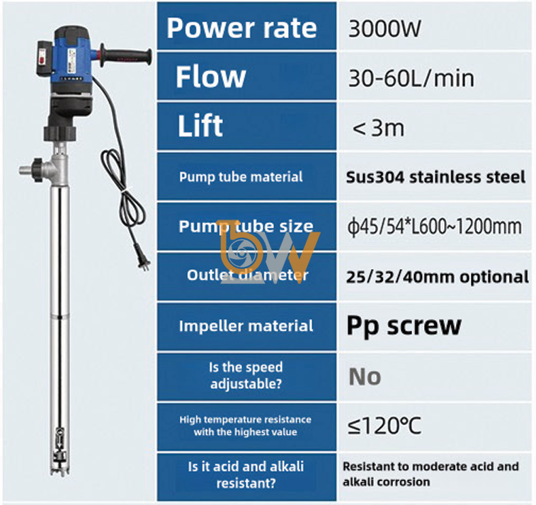 Ống bơm dài từ 600 – 1200 mm giúp thiết bị dễ dàng tiếp cận đáy thùng phuy 200L hoặc thùng chứa lớn. Nhờ đó, Máy bơm thùng phuy inox JDT-3000W-LGG120 có thể hút gần như toàn bộ lượng dung dịch trong thùng.