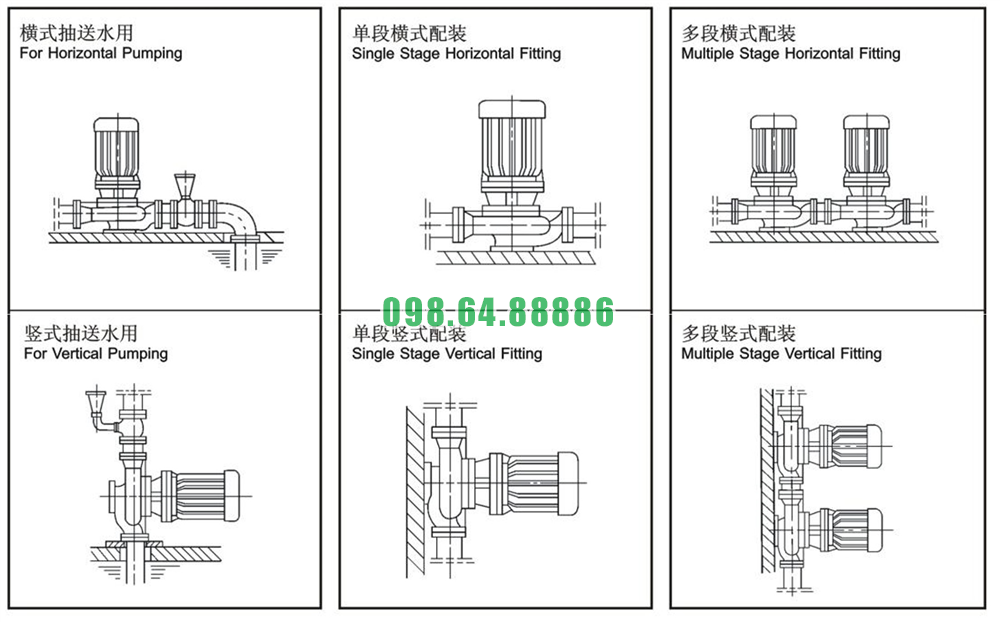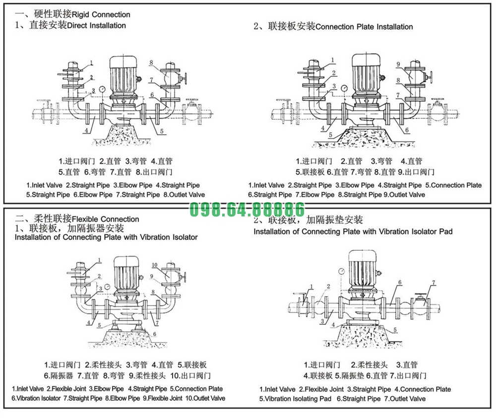 Bơm không được dùng làm gối đỡ cho đường ống. Bố trí giá đỡ, treo, giá trượt trước và sau bơm để triệt tiêu tải tĩnh/động từ ống, van, khớp giãn nở. Tải cho phép lên mặt bích theo hướng trục/ngang và momen phải nằm trong giới hạn nhà sản xuất.