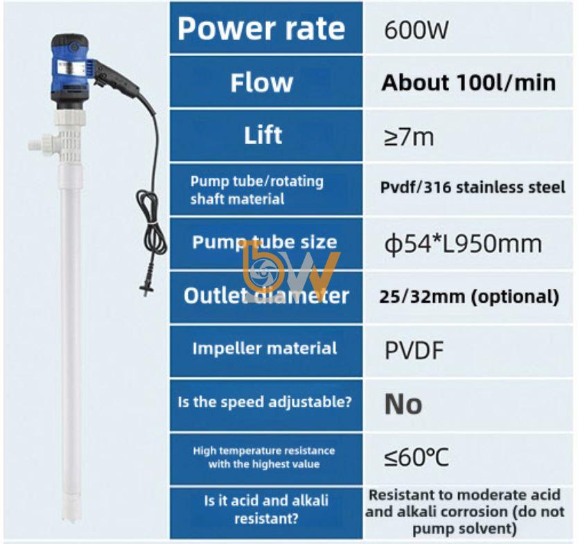 Nhờ động cơ điện 600W mạnh mẽ, vật liệu PVDF chống ăn mòn và thiết kế kín chống rò rỉ, máy mang lại hiệu quả chiết rót nhanh, sạch và an toàn, đáp ứng tiêu chuẩn trong các ngành công nghiệp hóa chất, xử lý nước và sản xuất dược – mỹ phẩm.