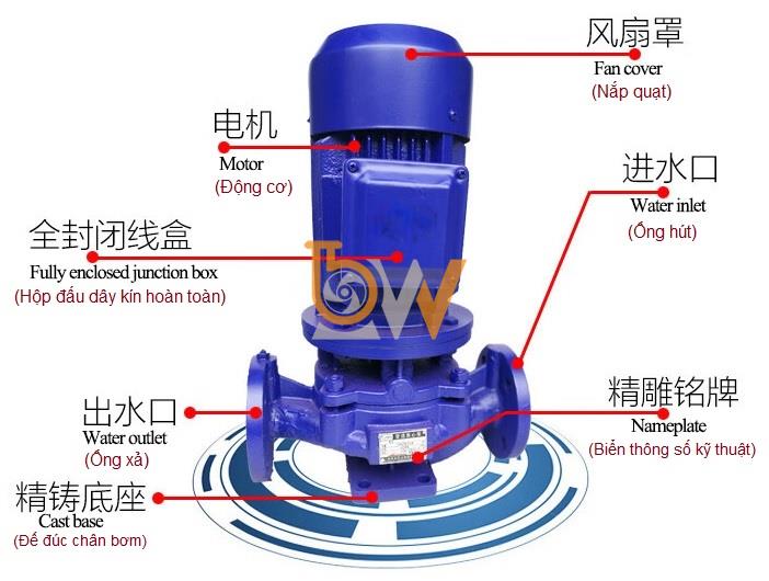 Động cơ đặt trên thân bơm giúp diện tích tiếp xúc sàn nhỏ, phù hợp phòng kỹ thuật nhỏ, giếng kỹ thuật dọc, tầng hầm thấp trần.